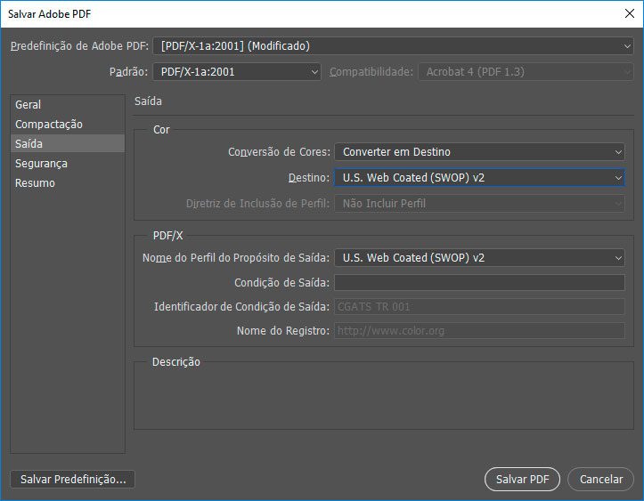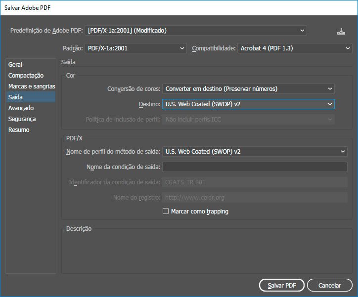 Tenha certeza de que na aba Saída a opção Destino esteja como U.S. Web Coated (SWOP) v2 e em seguida clique em Salvar PDF.