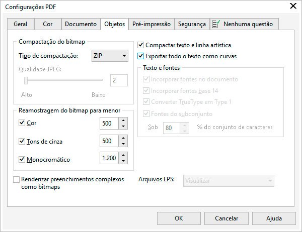 Na aba Objetos, em Tipo de compactação escolha ZIP, deixe selecionada as opções Compactar texto e linha artística e Exportar todo o texto como curvas, mude as opções Cor para 500, Tons de cinza para 500 e Monocromático para 1.200, clique em OK e depois em Salvar.
